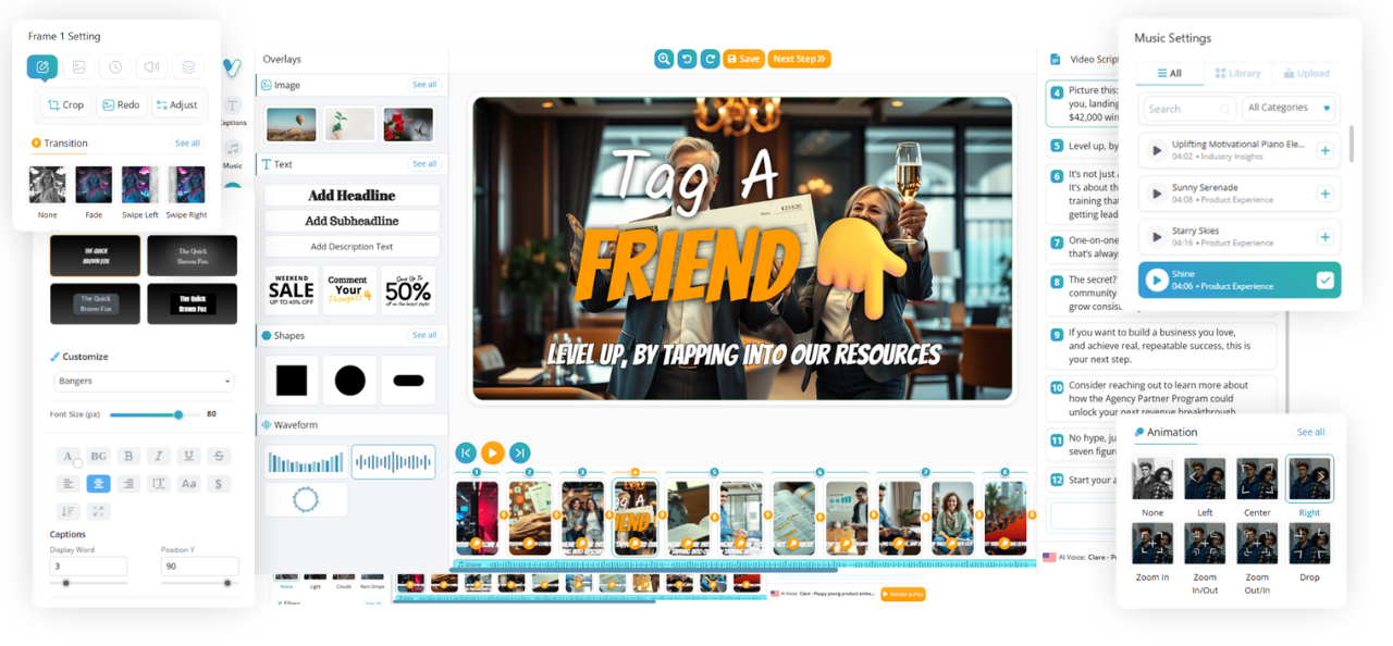 Need eye-catching videos for local campaigns? Generate them instantly. Want to turn a simple script or interview into professional video content? Just paste the text. Building authority fast? Transform any idea, update, or milestone into a viral-ready video with ease.