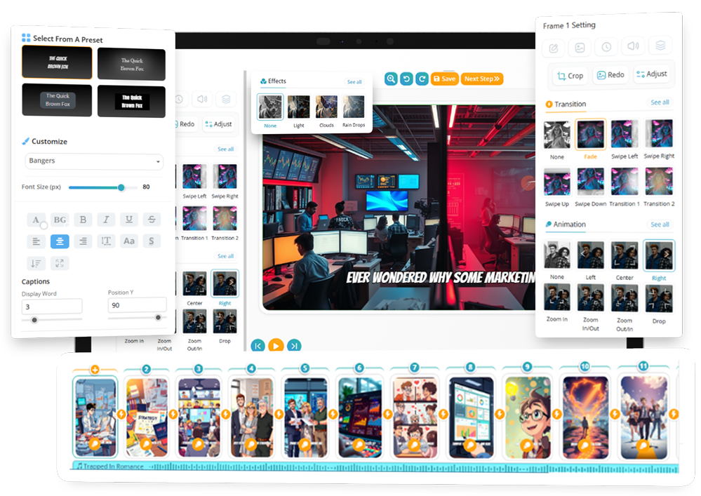 Precise editing capabilities with drag-and-drop simplicity — adjust timing, transitions, animations, and effects on individual frames without complex software knowledge.